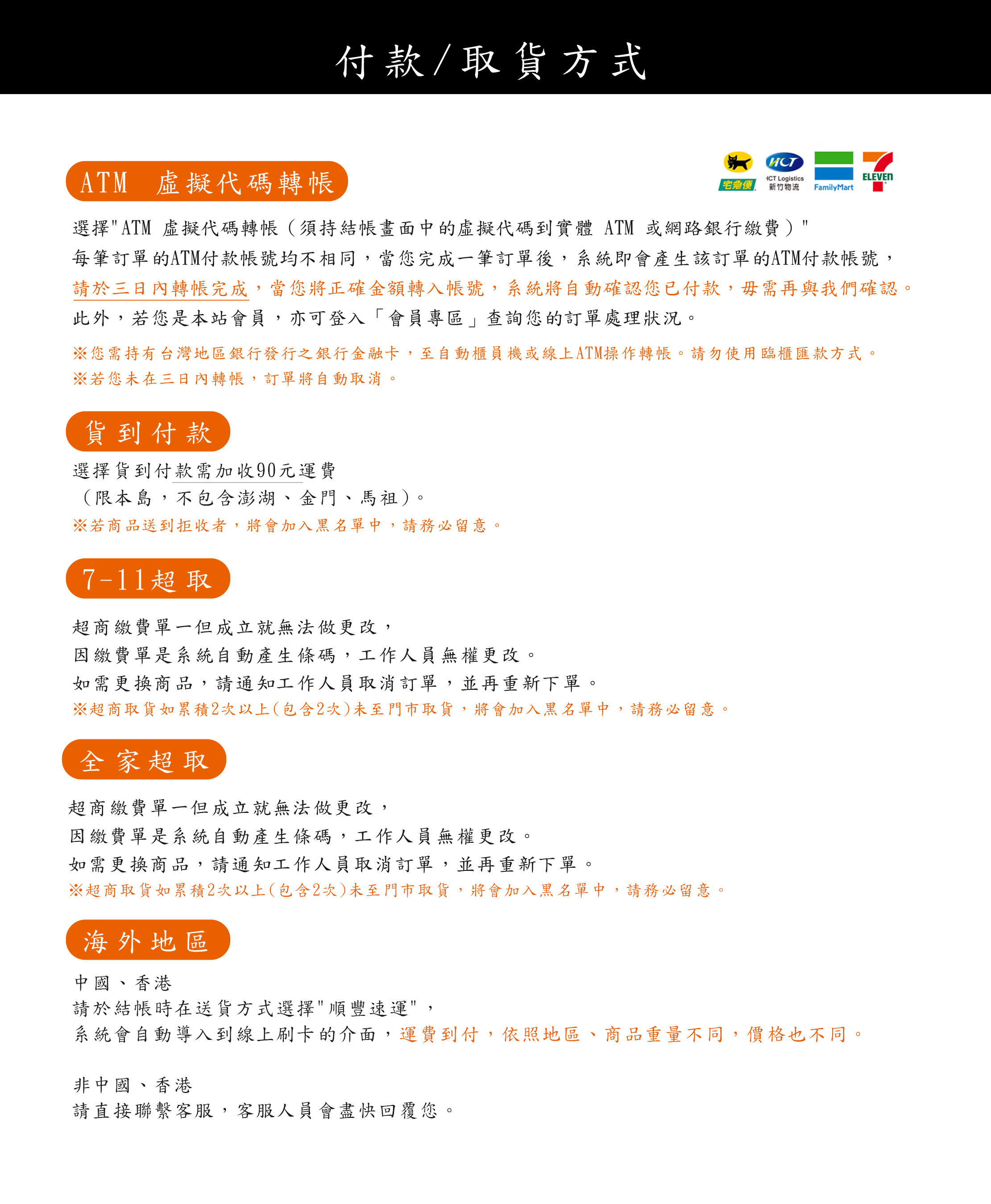 ※現貨部分付款後,約2-3天(不含假日)寄出,預購商品約2-7天(不含假日)寄出